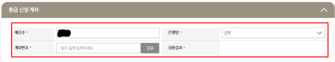 환급 신청 계좌 입력 후 신청, 검증결과에 검증완료로 표기되면 계좌 연결 끝