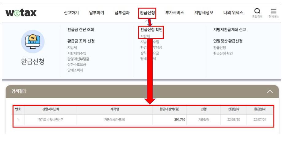환급신청 확인 클릭