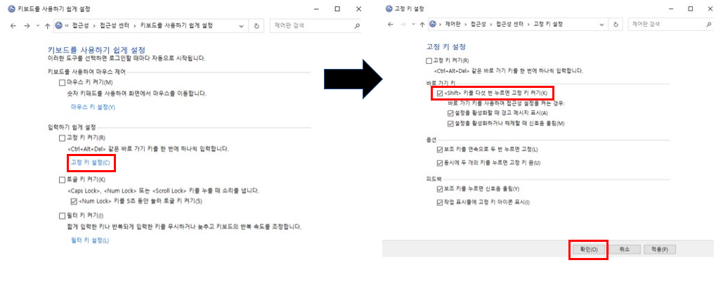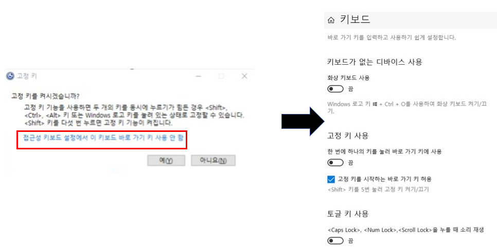 설정 창에서 shift 키를 5번 눌러 고정 키 켜기 / 끄기 및 하나의 키를 눌러 바로 가기 키에 사용 등을 꺼주시면 됩니다