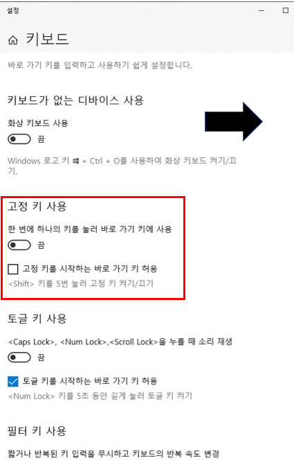 그래서 소개 할 내용은 윈도우10 고정 키 해제 방법입니다.