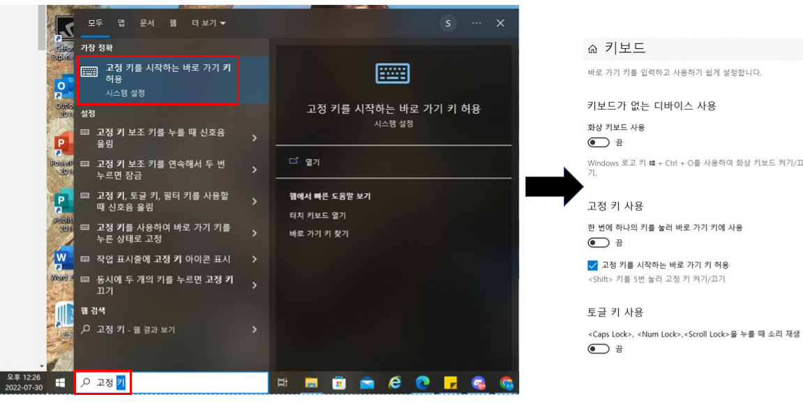 1. 윈도우 검색에 고정 키를 입력하여 설정 창 이동
